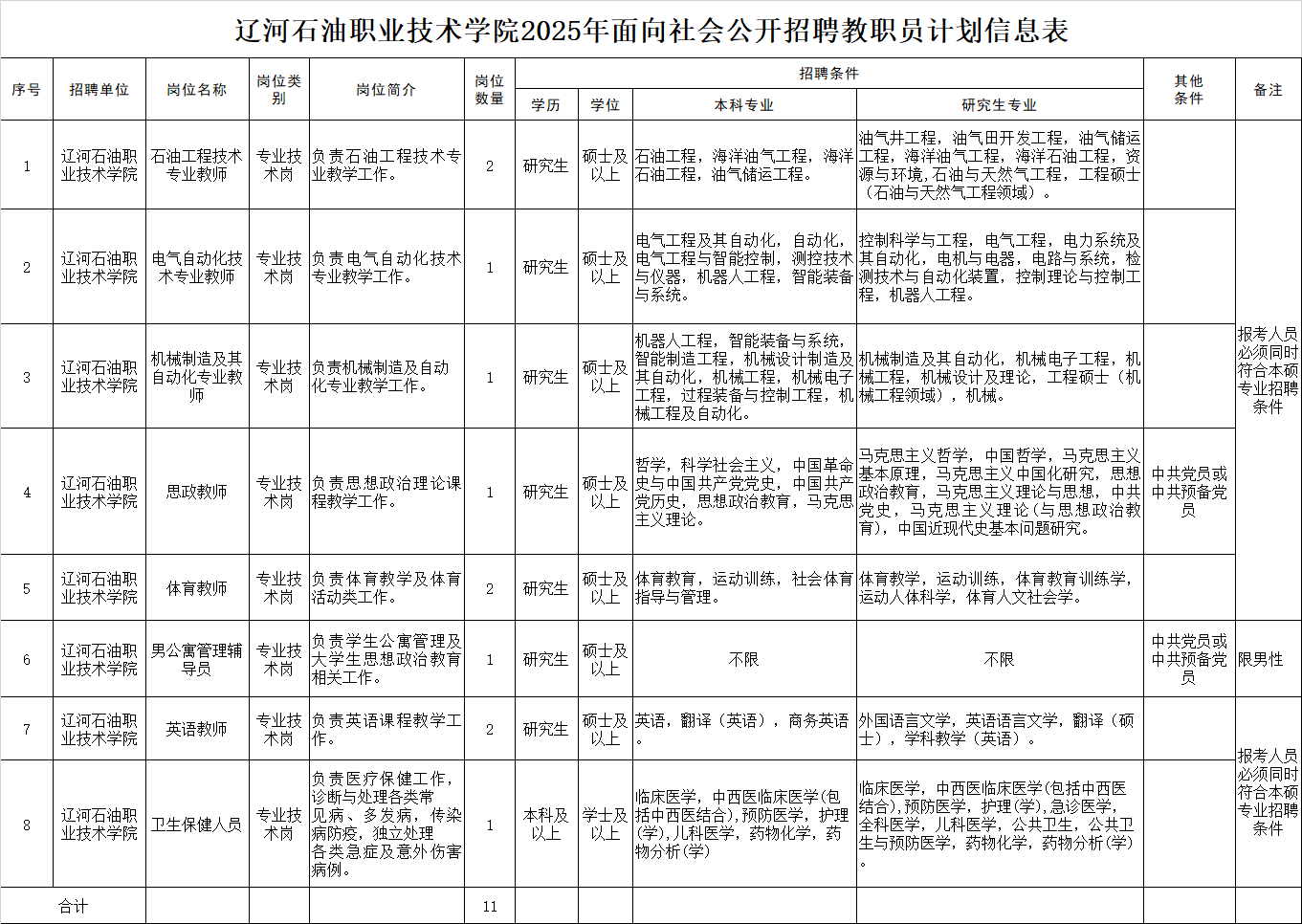 1.遼河石油職業(yè)技術(shù)學(xué)院2025年面向社會(huì)公開招聘教職員計(jì)劃信息表