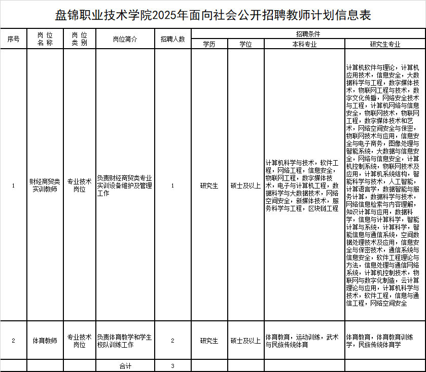 3.盤錦職業(yè)技術(shù)學(xué)院2025年面向社會(huì)公開招聘教師報(bào)名信息匯總表