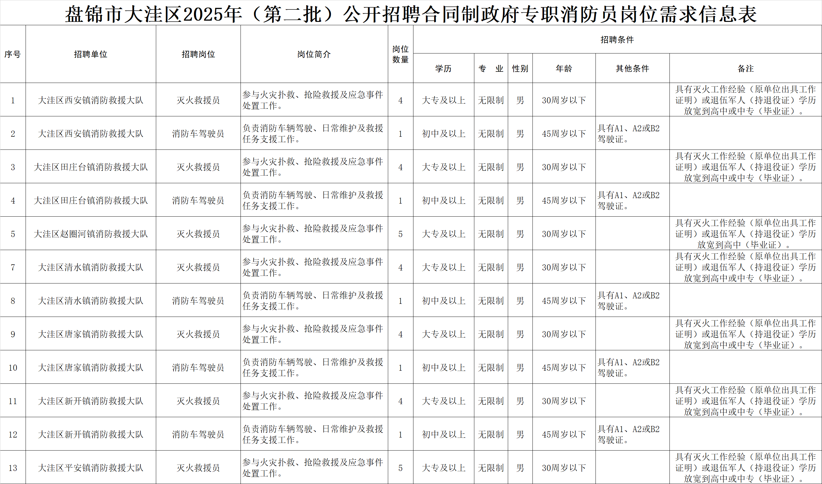 1.《盤錦市大洼區(qū)2025年(第二批)公開招聘合同制政府專職消防員崗位需求信息表》